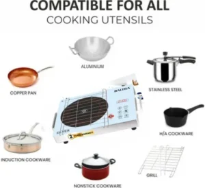 - ✔ Works with any type of utensil (steel, aluminium, cooker, tawa — everything) No need to buy special induction cookware