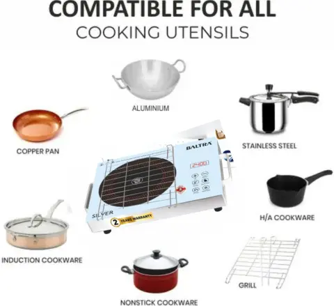 The Baltra BIC-167 uses infrared heating technology, which means it works with every type of cookware — aluminium, steel, copper, ceramic, glass, non-stick, and clay. No new utensils required. Plug it in and start cooking with whatever you already have in your kitchen.