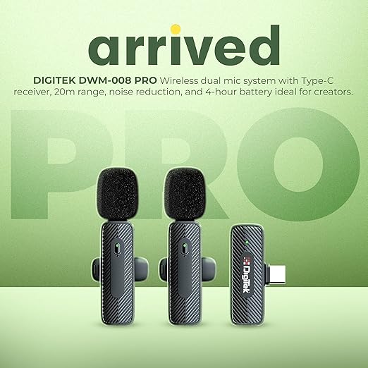 Buy the Digitek DWM-008 PRO wireless microphone kit at AKDMart Bandipora. Includes 2 mics + Type-C receiver, 20 m range, 4-hr runtime — ideal for YouTube, online classes & live streaming. Fast Kashmir delivery.