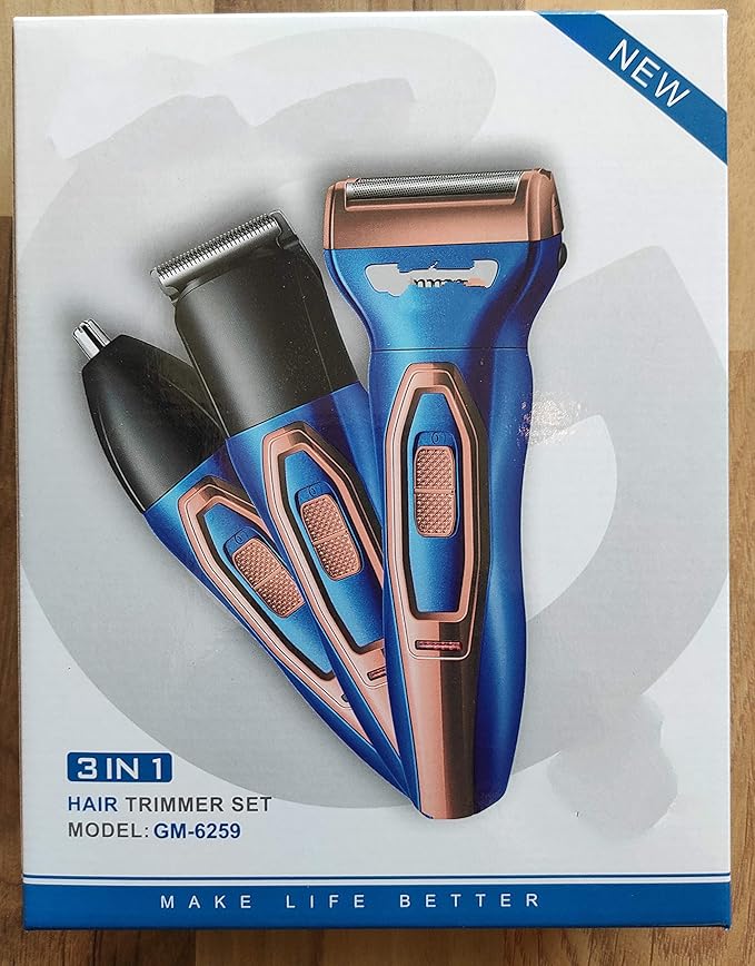 Buy the Geemy GM-6259 3-in-1 grooming kit at AKD Mart. Includes hair trimmer, shaver, and nose/ear trimmer. 60 mins cordless runtime, 4 length settings, stainless steel blades — an all-rounder for gro