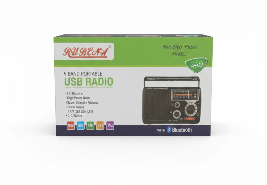 The Rubeena 5 Band Portable USB Radio is a reliable and easy-to-use radio designed for continuous music and radio listening. It supports FM, MW, SW, TV1, and TV2 bands, allowing you to enjoy a wide range of radio stations for news, music, and entertainment.