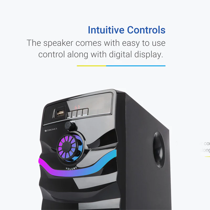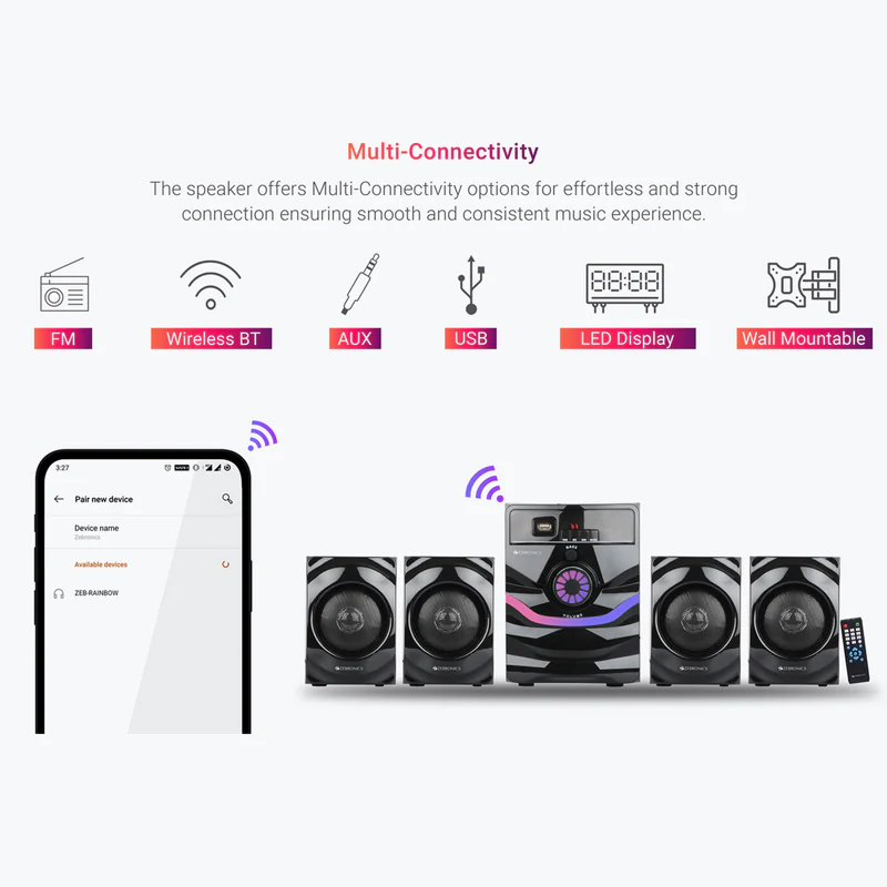 Buy Zebronics BTRUCF 4.1 Rainbow Bluetooth speaker system online at AKD Mart. Enjoy deep bass, RGB lights, and multi-connectivity options. Perfect for home and party setups.